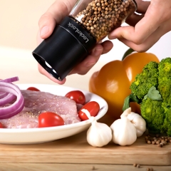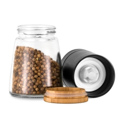 - Bình chứa tiêu bằng thủy tinh, trong suốt bạn dễ dàng quan sát trong quá trình xay.